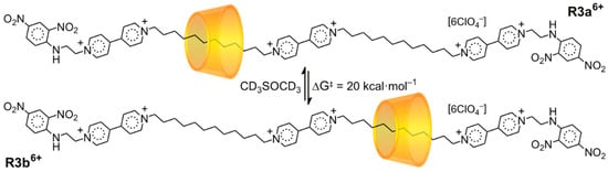 While it may seem initially that [2]rotaxane orientational isomers cannot interconvert without the ring either turning inside-out or executing an escape–rotate–rethreading sequence, Kawaguchi and Harada [] demonstrated an interesting case (Scheme 3) of orientational isomers that exchange by a ring-shuttling mechanism. As the α-CD ring of the [2]rotaxane oscillates between two ends of a symmetrical dumbbell, it alternately exposes its head (R3a6+) and tail (R3b6+) to the bipyridinium barrier at the center of the dumbbell. Rotating R3b6+ 180° such that its stoppers exchange sites can help one see that it is the orientational isomer of R3a6+, owing to the mirror symmetry of the dumbbell.