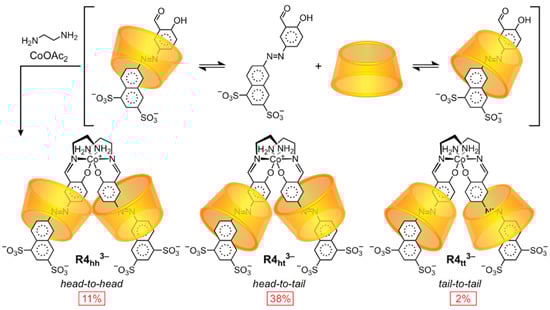 A team led by Anderson [] isolated, by anion exchange chromatography, all three orientational isomers—head-to-head R4hh3− (11%), head-to-tail R4ht3− (38%), and tail-to-tail R4tt3− (2%)—of [3]rotaxane upon conjoining a pair of salicylaldehyde-functionalized pseudorotaxanes around a Co3+ ion to create a symmetrical dumbbell in the presence of α-CD. The unequal distribution of products indicates a bias, but not complete selectivity, for the head-to-tail orientation. Later, the team prepared [] a head-to-tail orientational isomer with high selectively on an oligophenylene(ethynylene) dumbbell on porous glass solid supports. Selective syntheses of tail-to-tail [,] and head-to-head [,,,] [3]rotaxanes have also been reported (see Section 3.1.2). A [3]rotaxane based on oligothiophene-threaded β-CD rings has also been synthesized [] as a mixture of orientational isomers.
