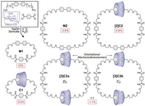 Macrocyclizing terephthaloyl chloride with a biphenylene unit bis-functionalized with flexible amine-terminated tetraethylene glycol linkers in the presence of heptakis (2,6-di-O-methyl)-β-cyclodextrin (DM-β-CD) afforded a mixture of [1+1] products (macrocycle M1, [2]catenane C1) and [2+2] products (macrocycle M2, [2]catenane [2]C2, and [3]catenanes [3]C2a-b). The pair of [3]catenanes, [3]C2a and [3]C2b, were isolated [] as a 1:1 mixture of head-to-head/tail-to-tail and head-to-tail orientational isomers, respectively, which may be distinguished by their different time-averaged (D2 and C2) symmetries. A group led by Otto [] has also observed [3]catenane orientational isomers within a dynamic combinatorial library of catenated cyclodextrins.