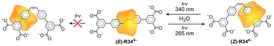 The mechanostereoselective translation of an α-CD ring along the dumbbell of a [2]rotaxane was first observed (Scheme 6) by Anderson []. The α-CD ring travels only head-first along the symmetrical isophthalate-stoppered stilbene dumbbell of (E)-R344− upon photoisomerization to (Z)-R344−.