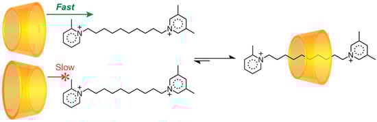In 2005, Harada’s group [] noticed that α-CD passes head-first over a 2-methylpyridinium stopper onto a decamethylene chain much more quickly than it threads tail-first. At lower temperatures, this rim-selective difference in threading kinetics allows one to obtain only one orientational isomer of the corresponding pseudo [2]rotaxane (Scheme 7). At elevated temperatures, however, tail-first threading becomes allowable and the system gradually equilibrates to an equal mixture of orientational isomers. A similar face-selective translation has been observed in several other pseudorotaxanes with similar directionally biased barriers [,,]. The temperature-sensitive process of a ring threading onto an axle over a size-matched barrier is known [,] as “slippage”. The mechanostereoselective motion can be utilized for stereoselective synthesis (see Section 3.1); for example, an α-CD [3]rotaxane was obtained [] as a pure head-to-tail orientational isomer by employing a slippage stopper that favors only a head-first threading.