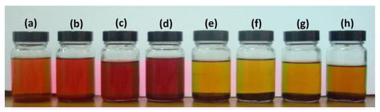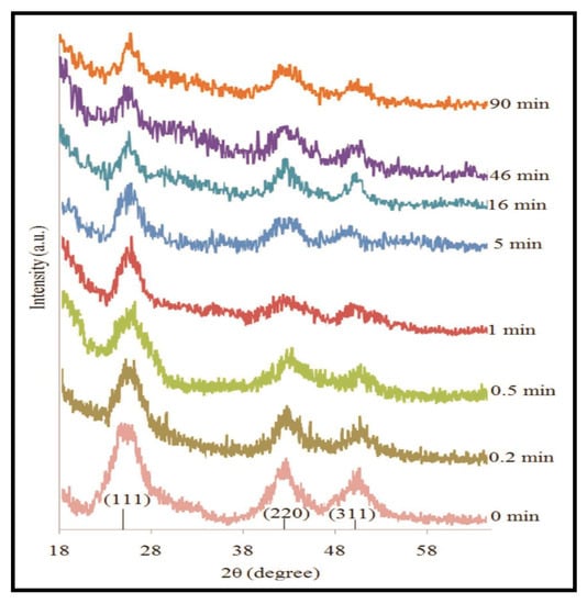 Figure 1 shows the vials of Mn-doped CdSe QD solution. The color variations during the reaction time were affected by the change in the size of the Mn-doped CdSe QDs. The observed colors are due to the strong photon absorption by the Mn-doped CdSe QDs at a particular frequency. The sample with an instant reaction time (0 min) has a light orange color, as shown in Figure 1a, while the solution with a reaction times of 0.2 min has a more intense orange color, as shown in Figure 1b. At a reaction time of 0.5 and 1 min (Figure 1c,d), the sample appears red. As the reaction times increased (16–90 min), the color turned to dark brown, as shown in Figure 1f,g, and the solution became light brown as the dark brown precipitates settled on the bottom of the containers. Due to the quantum confinement effect, the color differences are ascribed to the variation in the size of the QDs. Larger QDs emit longer wavelengths and smaller QDs emit shorter wavelengths, resulting in a different color emission [].