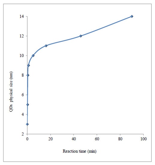 The relationship between QD growth and reaction time is shown in Figure 3. The growth of QDs at the early reaction time (0 to 0.5 min) is very important. The fastest growth was during the transition time from 0.2 to 0.5 min, as the high-energy surface was largely used to initiate the initial stage nucleation of Mn-doped CdSe QDs (0–0.2 min). As the reaction time increases, the growth becomes less prominent, particularly from 0.5 to 90 min. This is due to the decrease in the ionic concentration of the chemical precursors in the solution as the time gets longer [,]. Furthermore, a narrow particle-size distribution was noted in each sample. Despite the narrow size distribution, there appears to be a slight increase in the overall size distribution over the reaction time. This produces larger QDs, owing to the agglomeration of particles. At the same time, the development of intrinsic QDs continues owing to the chemical precursor residue. This will generate a wide QDs size distribution. The tendency to agglomerate can be compared to the core or bulk of QDs throughout the heating process due to the excessively high surface energy on the surface of the QDs, which is favorable for the build-up of the surface or the shell of QDs. This means that QDs have a tendency to grow as long as there is heating. Despite this, as the reaction time increases, the concentration of chemical precursors such as Cd, Se, and Mn decreases. This retards the development of the QDs surface. Therefore, instead of producing QDs, excessive surface energy enhances the propensity of QDs to agglomerate [].