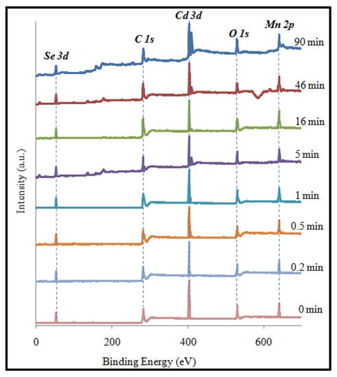 Another interesting feature of XPS spectra is the peak broadening. Table 1 tabulated the full width at half maximum (FWHM) of Cd 3d, Se 3d, and Mn 2p peaks. The FWHM of Cd 3d ranged between 1.3 and 1.5 eV for 0 to 5 min reaction time samples, but then the FWHM values show a clear increase in the 16 min to 90 min samples. Se 3d and Mn 2p show narrowly distributed FWHM values for 0 min to 16 min samples. The FWHM values increased for the 46 min and 90 min samples. This increment may be relative to the QDs size increment, especially for Cd 3d since Cd is predicted to be the larger carrier donor at the surface of QDs. Besides, increases in the energy band gap were inversely proportional to the QDs. To elaborate further, Equation (2) shows that the relationship between the energy band gap () and the carrier effective mass () are also inversely proportional, where ℏ and are constants factors.