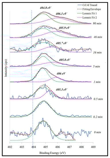 In addition, the intensity of Cd 3d peaks was observed to decrease from 3364 to 2000 cps as the QDs size increases. This may be due to the increases in electron concentration that leave the CdSe Mn-doped QDs solid samples after been irradiated by X-ray as the size of QDs became smaller. The smaller QDs have a larger surface area thus, larger sample area is exposed to the x-ray, resulting in a higher concentration of electron emitted from the QDs surface []. A great drop in peak intensity was observed for the 0 to 46 min samples and became stable in the final stages (46 min and 90 min). The influence of QDs size on the peak intensity was less pronounced as the size became larger than 12 nm.