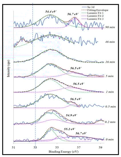 Figure 7 shows the individual XPS peaks of Se 3d and its Lorentz fits. Contrary to the Cd 3d results, no obvious shift of original peak was observed. On the other hand, the Lorentz fit 1 shifted to a smaller binding energy (404.2 eV) for the 0 min and 0.2 min samples, which also may be due to the function of QDs size in the chemical shift. Lorentz fit 2 shows readings ranging from 54.9 to 56.7 eV, excluding the 46 min and 16 min samples. XPS spectra for 0 min samples fitted to have extra Lorentz fit at 56.7 eV. Lorentz fit 2 and 3 indicated the influence of the Se 3d5/2 band in the binding of CdSe QDs. As in Figure 5, the spinning up orbital dominates the Se system, excluding 46 min and 16 min, which may be due to the absence of spinning orbital interaction []. Interestingly, in the 0 min samples, the Se 3d peak exhibits three Lorentz fitting features, 54.4 eV corresponds to the Se 3d band, and 55.2 and 56.7 eV correspond to 3d5/2, which is assumed to be due to the band structure complexation due to the higher density of lattice strain of core CdSe QDs where the Se atom is mainly located.
