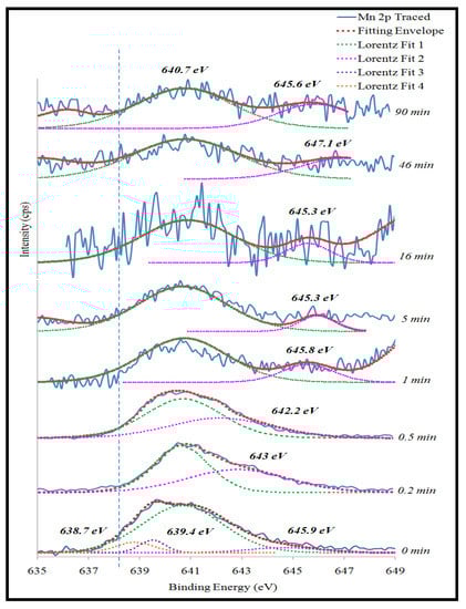 Figure 8 shows the Mn 2p traced for Mn-doped CdSe QDs, which is crucial to prove the presence of Mn acts as a shell in core-shell Mn-doped CdSe QDs samples. The Lorentz fit 1, which corresponds to the Mn 2p band with a binding energy of 640.7 eV is well fit in each sample. Lorentz Fit 2 with binding energy ranging from 642.2 to 645.9 eV in each XPS scan initially created a shouldering peak and eventually shifted to create another defined peak as the QDs size increased. The role of the Mn shell as a lattice strain inducer may change with the growth in the size of the QDs. Moreover, the presence of Lorentz fit 3 and 4 for the 0 min sample suggests there are extreme changes in the lattice parameter at critically small QDs, which may be induced by the Mn shell. Overall, the intensity of the Mn 2p peaks declined as the size of the QDs increased. This could be due to the decrease in the thickness of the Mn shell as the size of the QDs increases, which is related to the function of Mn ion concentration with reaction time [].