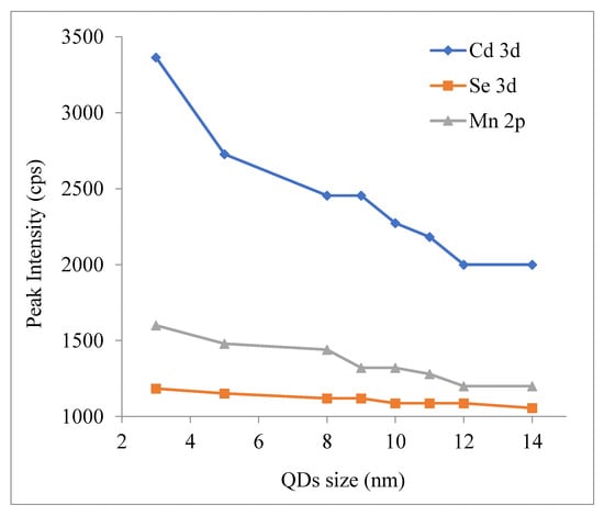 The oxidation states of an exciting element are generally reported to be 2 for Cd, ±2, 4 and 6 for Se [] and 7, 6, 4, 2 and 3 for Mn []. Figure 9 shows the relation between the Mn-doped CdSe QDs size with Cd 3d, Se 3d, and Mn 2p XPS peak intensity. Traced Cd 3d element shows the high values of peak intensity compared to Se 3d and Mn 2p. This is due to the high concentration of Cd atoms on the surface of QDs, which are presented as a Cd-oleate that acts as a ligand, and Cd atoms that are near the core-shell intermediate. These also suggest that Cd has an important role as the major electron donor in the Mn-doped CdSe QDs system. The relationship between the XPS peak intensity and the ion or atom concentration is strongly supported by Equation (2) where the electron intensity () presented by XPS peak are directly proportional to the concentration of the atom or ion on the samples (), especially on the surface of the samples [,].