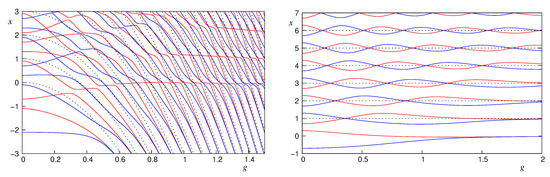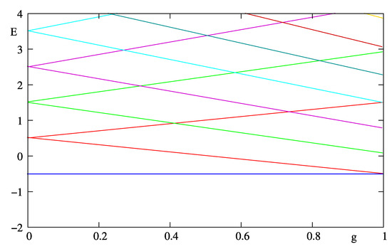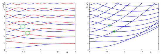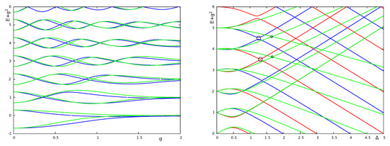 The character group of is , therefore each one-dimensional irreducible representation of is labeled by an integer . In the representation in Equation (4), the space spanned by the vectors and for is invariant and acts on it as . Therefore, the decomposition in Equation (3) corresponds to the irreducible representations of in for integers and the spectral problem for the JCM reduces to the diagonalization of -matrices in the spaces [4]. If one parameter of the model is varied, say the coupling g, the spaces do not change, only the eigenvectors , and the eigenenergies . The spectral graph as function of g consists of infinitely many ladders with two rungs, intersecting in the -plane as shown for in Figure 2.