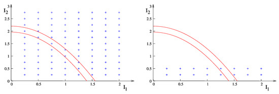 (Left) The energy shell (red lines) contains the integer-valued vectors (blue crosses) belonging to the quantization of the action variables and . The distance of adjacent energies is statistically unrelated for large quantum numbers if is non-linear. (Right) If the second action variable can take only two values as would be the case for a discrete degree of freedom with dim, the average level distance is the same as for linear and Poisson statistics does not apply.