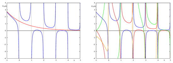 vanishes for parameters . One sees immediately that entails , thus this state is non-degenerate if it exists. States of this type comprise the non-degenerate exceptional spectrum [42] and are characterized by a lifting of the pole of (resp. ) at for special values of , satisfying . The exceptional G-functions in Equation (22) are given in terms of absolutely convergent series expansions as the regular G-functions in Equation (10). The other possible Frobenius solution at , , leads to