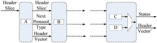 Microarchitecture of the parser. The dotted-line frames represent the pipeline stages; while A, B, C, and D represent different header processing modules.