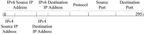 As the 5-tuple includes the IPv6 and IPv4 addresses, which are of the same type but have different lengths, the longer addresses should be used to calculate the width of the vector. Thus, the length of the header vector should be equal to the total lengths of IPv6 IP addresses, protocols, and ports—i.e., 296 bits. In addition, IPv4 addresses share the same space of the same type and remain aligned with the same starting position of the IPv6 addresses, as shown in Figure 2.