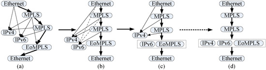 - Choose any one of the rest of the nontrunk nodes and identify all of its parents in the trunk. Then, reserve the dependency relationship with the last node in the trunk and delete the other dependencies. For example, if “IPv6” is selected, the reserved dependency should be that between “IPv6” and the second “MPLS” in the trunk, as shown in Figure 3b. The dependencies marked by dotted arrows will be deleted. This means that the packet cannot be directly transferred from the “Ethernet” stage and the first “MPLS” stage to the “IPv6” stage.