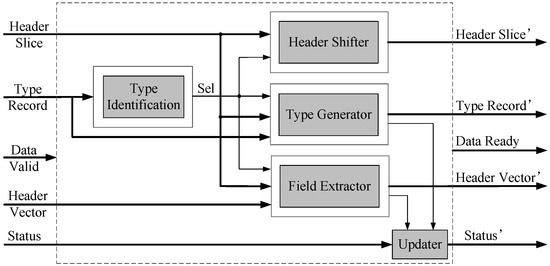 The “Type Record” is a register vector that stores the code of all supported protocols—parsing the previous protocol header always marks its next header. The function of this component is to check whether its corresponding code has been marked by its previous pipeline stage, which means that the rest of the components in this module need to handle the current header in this cycle. Otherwise, processing is not required.