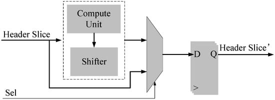 This function consists of a “compute unit”, which calculates how many bits should be shifted out; a shifter to implement the shifting; a MUX for choosing a source; and a register vector to store the header slice. The “compute unit” provides a constant shift number for protocol headers of fixed length, such as IPv6, ICMP, etc. The variable shift number for the protocols is also calculated using this function for the protocol headers of variable lengths. The selected signal “Sel” is drawn from the function of the “Type Identification” to select the new header or the original header.