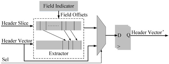 If this component is enabled, fields in the header slice are copied to specific positions in the header vector. The component consists of a “Field Indicator”, an “Extractor”, a MUX, and a register vector. Figure 6 presents the hardware architecture.