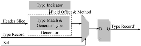The code or flag of the protocol header type is always stored in a field of its previous protocol header. The type of the next protocol is extracted or generated, and will then be updated in the “Type Record” vector in this component, which includes a “Type Indicator”, “Type Generator”, MUX, and register vector. Figure 7 presents the hardware architecture of the type generator.