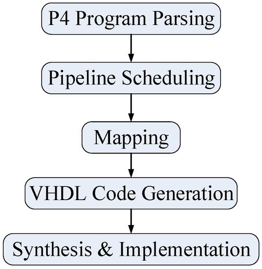 Several steps are needed to convert a P4 program to VHDL, namely—P4 program parsing, pipeline scheduling, mapping, VHDL code generation, synthesis, and implementation. Figure 8 below shows the workflow.