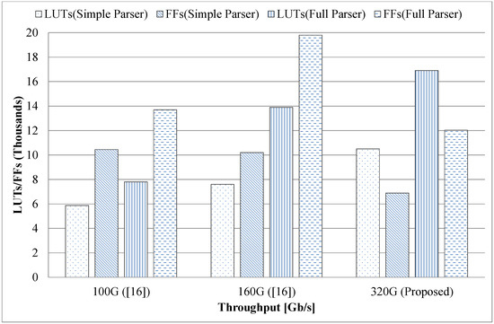 Throughput Comparison: When directly compared to the parsers of [15,16], our proposed parsers have higher throughput, achieving more than 300 Gbps—however, this comparison is based on situations involving different data bus widths and clock rates. We can assume that the clock rate will not decrease for double and triple, [15,16], respectively, and that their throughputs are still lower than ours. In addition, as our parser processes only the header slice, which is part of the packet, the throughput should be higher than that recorded in the above table.