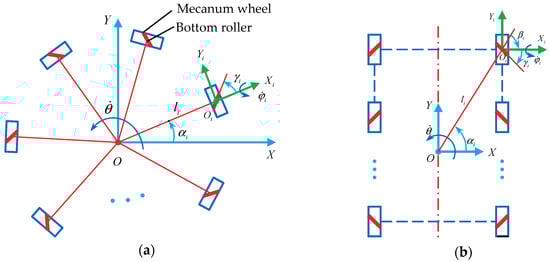 For an independent Mecanum-wheeled mobile robot, the wheel configurations can be mainly divided into two categories: centripetal configuration and symmetrical rectangular configuration [], as shown in Figure 1. In Figure 1, the Mecanum wheel is represented by a rectangle with an oblique line in the middle, in which the oblique line represents the bottom roller that contacts with the ground. In the former configuration, the axles of all wheels intersect at the same intersection point, as shown in Figure 1a. In Figure 1a, the centerline of the mobile robot coordinate system and wheel local coordinate system is collinear with coordinate axis . In order to balance the load of each wheel, the wheels are evenly distributed in a 360° circumference. This centripetal configuration of an omnidirectional mobile robot usually composes of three [,] or four [] Mecanum wheels. In the symmetrical rectangular configuration in Figure 1b, the Mecanum wheels are symmetrically arranged on both sides of the line going through the center of the robot, and the overall structure is rectangular. Based on the study of the kinematics constraints of a single Mecanum wheel, the kinematics model of an n-Mecanum-wheel mobile robot can be further derived, and then the omnidirectional motion characteristics of the mobile systems can be analyzed.