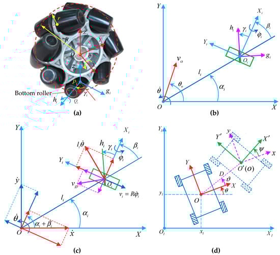 In order not to lose generality, a mobile robot consisting of n Mecanum wheels is designed, in which the i-th wheel is mounted on the body at a certain angle, as shown in Figure 2. R and r are the radius of the wheel and the radius of the roller, respectively; is the center of the i-th wheel; represents the direction passing through the wheel center and perpendicular to the ground; is the center of the roller contacting the ground, is the contact point between the roller and the ground, according to the hypothesis, both of them are under at the same time; represents the direction passing through the roller center and perpendicular to the ground. and represent the rotation axis direction of an active Mecanum wheel and passive roller, respectively. The two angular velocity vectors are and , and and constitute the right-handed Cartesian coordinate system , and constitute the right-handed Cartesian coordinate system . is used to describe the relative installation orientation of the origin of the body coordinate system and the center of the wheel; the angle between the axis and the is , which is defined as the installation attitude angle of the local coordinate system of the wheel; the velocity of the motion center is in the current state, and the angle between the and the axis is ; is the rotation angular velocity of the system when moving in the plane. The angle between the projection of and on the plane is the tilt angle () of the roller.