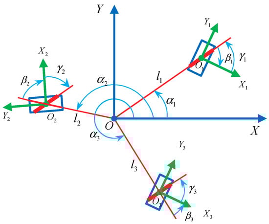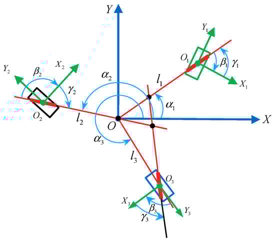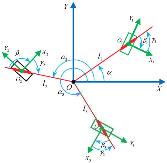 When the axles of the three bottom-rollers intersect at three points, no two axles of the bottom-rollers can be parallel or coincide with each other, as shown in Figure 6. The coordinate system is established by arbitrarily selecting one of the intersections as the origin. The relationship of the parameters is shown in Table 4.