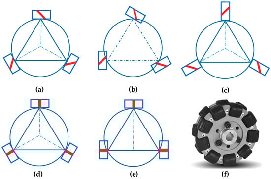 Three-Mecanum-wheel configurations: (a) centripetal circular array configuration; (b) Non-centripetal circular array configuration; (c) star-type circular array configuration; (d) centripetal circular array configuration of orthogonal Mecanum wheels; (e) T-configuration of the orthogonal Mecanum wheels; (f) an orthogonal Mecanum wheel.