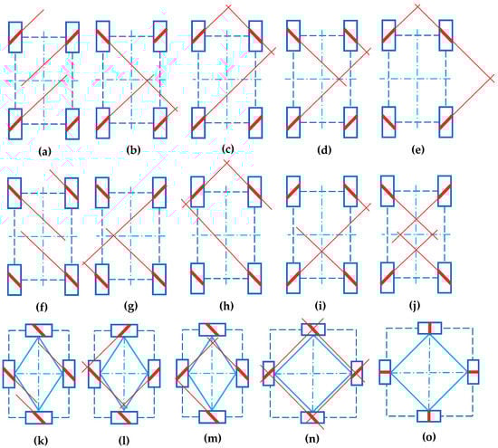 At present, the mobile robot with four Mecanum wheels is the most popular configuration in both scientific research and industrial application. There are many possible wheel configurations for the four-Mecanum-wheel robot [,,], some of them are illustrated in Figure 8. In Figure 8, the inclined line on the wheel in the figure represents the inclined direction of roller in contact with the ground. Figure 8a–j show 10 rectangular configurations of four wheels that are arranged at the corner and whose axles are parallel to the centerline of robot. Figure 8k–n show four possible centripetal configurations of four wheels. Figure 8o shows a centripetal circular array configuration of four omniwheels. In the configurations (a), (f), and (k), any three roller axles are parallel to each other or coincide with each other. The number of intersection points of the three roller axles is 0 or 1 (the overlapping axles are considered to intersect at one point). The column ranks of the Jacobian matrix of these configurations are 2. These configurations obviously cannot achieve omnidirectional movement. In the wheel configurations (b)–(e), (g)–(j), and (l)–(n), the axles of the bottom-rollers of three wheels intersect at two points, so the Jacobian matrices of these wheel configurations are column full-rank matrices. In theory, these configurations can achieve omnidirectional movement in the plane.