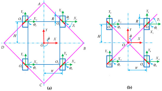 The two symmetrical rectangular configurations of the four-Mecanum-wheel mobile robot are shown in Figure 9. Choosing the geometric symmetry center as the origin , the rectangular coordinate system fixed with the mobile robot is established. The structural parameters of each Mecanum wheel are the same; therefore, ( is positive) and ().