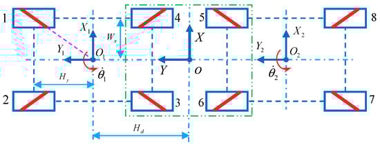 In Figure 10, the coordinate system located in the symmetric center of the tandem configuration is established. Its offset relative to the two local coordinate systems and is . Let be the generalized velocity of the system and the angular velocity of the i-th Mecanum wheel be . The inverse kinematics equations of the two four-Mecanum-wheel configurations are derived when the original coordinate system is moved to the designated coordinate system .