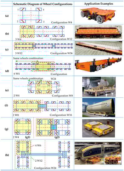 Common symmetrical rectangular wheel configurations and application examples: (a) the typical four-Mecanum-wheel configuration W4; (b) a 12-Mecanum-wheel configuration W12; (c) a combination configuration W36 with three W12; (d) a 24-Mecanum-wheel configuration W24; (e) an eight-Mecanum-wheel configuration W8, the example: MC-Drive TP 200 of CLAAS; (f) the combination configuration W16 with two W8, the example: the combination of two MC-Drive TP 200 []; (g) an eight-Mecanum-wheel configuration W8, which can combine into a 16-Mecanum-wheel configuration []; (h) a rectangular combination configuration consisting of four W6 []. The examples in (a–d,h) are KUKA omniMove AGVs.
