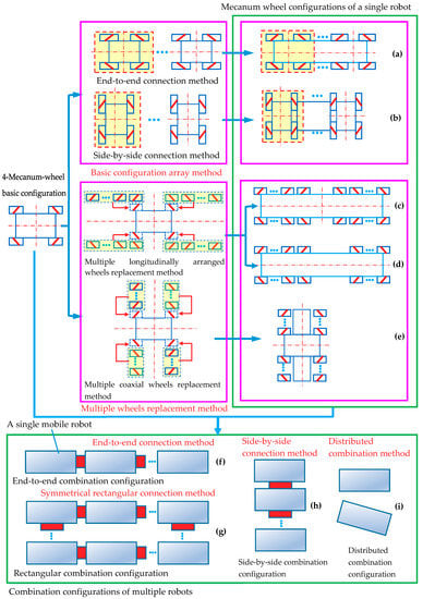 Using the multiple wheels replacement method, based on the basic four-Mecanum-wheel configuration, each wheel of the four-Mecanum-wheel configuration is replaced with multiple identical wheels. The wheel can be replaced by two types of wheel combinations: a series of longitudinally arranged wheels and a series of coaxial wheels, and the new configurations can be obtained, as shown in Figure 12c–e. If the number of longitudinally arranged wheels in the front- and rear-array wheels is the same, a symmetrical Mecanum-wheel configuration can be obtained, which is symmetrical in both left and right and in front and back, as shown in Figure 12c. If not, the Mecanum wheel configuration is only symmetrical in left and right, and not in front and back, as shown in Figure 12d. Among these configurations, configurations in Figure 12a,c are more commonly used. Using the above two methods, the suitable wheel configurations for the single mobile robot can be obtained. Multiple single robots can be arranged by combination methods, including end-to-end connection, side-by-side connection, symmetrical rectangular connection, and distributed combination methods; and then, the abundant combination configurations of robots can be obtained, including end-to-end combination configuration (Figure 12f), side-by-side combination configuration (Figure 12h), rectangular combination configuration (Figure 12g), and distributed combination configuration (Figure 12i). The distributed combination configuration means that there is no physical connection among the independent mobile robots. This belongs to the research field of multi-robot cooperative motion. In this article, a detailed analysis of the distributed combination configuration is not carried out.