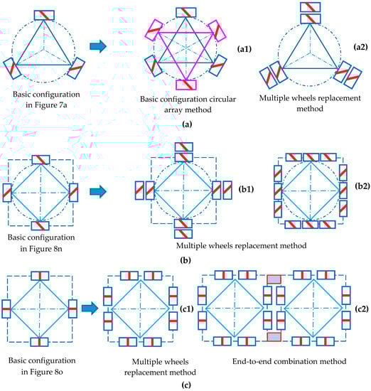 Using the topological design method for Mecanum wheel configurations proposed in this article, abundant wheel configurations can also be deduced based on other basic Mecanum wheel configurations. Using the circular array method, the centripetal three-Mecanum-wheel configuration shown in Figure 7a can be arrayed as a centripetal six-Mecanum-wheel configuration, as shown in Figure 13a1. Using multiple coaxial wheels replacement method, the wheel configuration in Figure 13a2 can be obtained based on configuration in Figure 7a. Using the multiple wheels replacement method, the configurations in Figure 13b1,b2 are obtained from the basic configurations in Figure 8n and the configurations in Figure 13c1 is obtained from the basic configuration in Figure 8o. Using end-to-end combination method, a combination configuration shown in Figure 13c2 can be obtained based on the configuration in Figure 13c1.