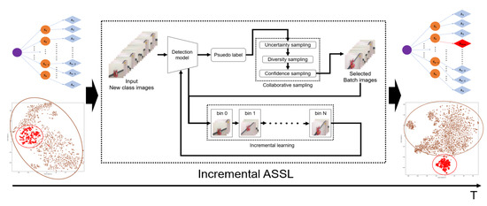 The proposed incremental open-set-aware ASSL combines the AL paradigm’s uncertainty and diversity characteristics with the incremental SSL paradigm’s confidence property. Taking into account AL’s uncertainty criterion, most uncertain samples are considered as the most helpful training samples to be added, as they are anticipated to be wrongly classified with high probability by the present detection model. However, the uncertainty criterion may cause noisy or redundant samples to be selected. We adjusted a pool-based (batch or bin) AL structure coupled with incremental SSL philosophy based on AL and SSL’s collaborative sampling method in terms of uncertainty, variety, and trust criteria that are expected to select more informative and low-redundancy training samples.