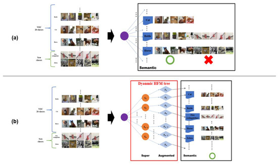 (a) General object detection flat model, which has good performance on trained class images. However, if the model meets untrained class data, there are many errors. (b) Our dynamic hierarchical feature model (HFM) tree framework, constructed by superclass and augmented class level. When data reach the augmented class node, the augmented class node is matched to a semantic class.