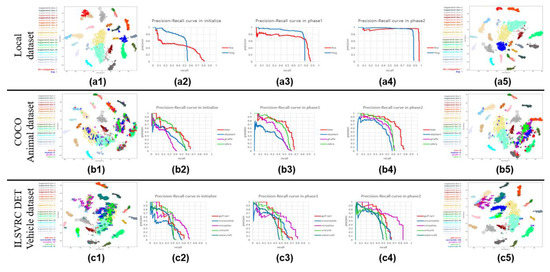 Result of applying dynamic HFM to other datasets. The visualization method was t-Stochastic Neighbor Embedding (t-SNE). (a) Series in local dataset, (b) series from COCO animal dataset, and (c) series from ILSVRC vehicle dataset. (a1) Input data distribution and (a5) output data distribution applied to our method. (a2–a4) Precision–recall curve in the training phase included in our ASSL method. (a2) Initialized model result, (a3) training phase 1 result, and (a4) training phase 2 result. COCO dataset and ILSVRC DET dataset results were similar to the local dataset.