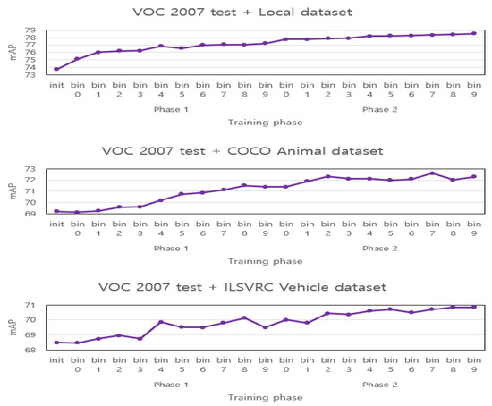 Results of increasing performance over time in incremental ASSL training of each dataset. Y-axis shows mean average precision (mAP), and x-axis shows number of bins and training phase.