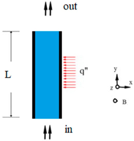 Jamalabadi [] examined the effects of EMHD on subcooled boiling in a vertical annulus tube. Gravitational and EMHD forces were included in the momentum equation, and viscose dissipation, joule heating, and radiation were included in the energy equation. He showed that EMHD could reduce the phase transfer rate and change the velocity difference between the phases, volume forces, and dissipative components. The friction coefficient and joule heating were also increased by EMHD forces. Dogonchi et al. [] numerically investigated the natural convection of magnetohydrodynamics in Cu–water nanofluids in a wavy cavity using a finite element control volume method. The effective viscosity and thermal conductivity of the nanofluids were defined by relationships in which Brownian motion effects on thermal conductivity were considered. In that paper, the influence of various parameters such as the Rayleigh number, wave contraction ratio, Hartmann number, and undulation number were calculated and presented. Average and local Nusselt numbers were also computed and reported.