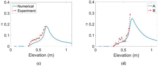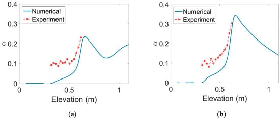 For validation, the percentage of relative error resulting from the mesh-independent solution is given in Table 4. As can be seen in this table, the percentage of relative error decreased with decreasing grid size. Therefore, the grid size was considered to be 0.01 to solve the present study. In accordance with other studies and due to the importance of the volume fraction, the variation of this parameter along the channel for all four states was investigated and is presented in Figure 2. It can be seen that the results of the numerical and experimental modeling [] were in good agreement, and the results of the solution were reliable. The calculation showed that the error amount was less than 5% for the four modes in Figure 2.