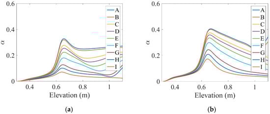One of the critical nondimensional numbers in the determination of a vertical pipe regime is the Froude number (), which represents the ratio of fluid inertia to gravity in two-phase continuum mechanics. The Froude number variations along the channel length for the four different states stated in Table 1 are shown in Figure 4a. This number is used to measure the effect of gravity on the repulsion of one phase over another or to describe the relative velocity between phases. When the relative velocity between the phases is large, it causes instability between the momentum fluxes. Therefore, according to Figure 4a, the Froude number was unchanged at the beginning of the tube and in the region where heat flux was applied to the flow: as the flow rate increased, it increased. Then, under the influence of the magnetic field force, its value decreased, indicating more flow control. At the different values of the magnetic field presented in Table 2, the Froude number was smaller than 1, indicating that only small surface waves could move upstream. In fact, the decrease in the Froude number along the fluid path reflected the effect of the magnetic field in reducing the effects of surface waves.