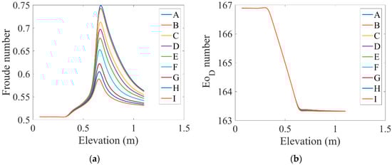 Dimensional number changes of (a) Froude and (b) Eötvös along the channel length for the four different states shown in Table 1 under the influence of the magnetic field.