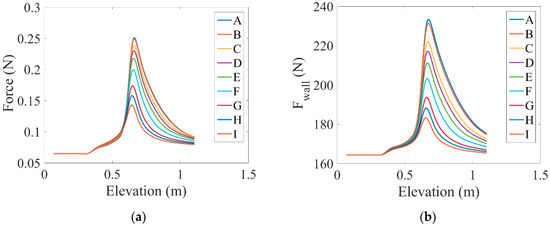 The fluid impact resulted in an increase in pressure of the water hammer and could affect the boundary wall of the tube. The changes in fluid wall forces along the length of the tube under the influence of different values of the magnetic field are plotted in Figure 5b. This force was perpendicular to the flow direction and resulted in corrosion of the pipe wall. The fluid wall forces could be obtained by multiplying the fluid mass flux and velocity of sound in the tube (). As shown, the wall tube forces increased in the heated area, and as the MHD forces increased, the peak of the wall tube forces decreased. As you can see, the amount of this force was much higher than the other forces shown in Figure 5, which indicated a more significant impact and importance of this force.