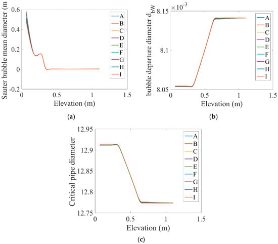 Figure 7a shows the bubble Sauter mean diameter along the length of the tube under the influence of different values of the magnetic field. The bubble diameter in a given vapor volume fraction is related to the concentration of the interfacial area. The mean diameter of the bubble can be equal to half the maximum diameter of the bubble and can be evaluated from a critical Weber number and the relative velocity. As can be seen, the Sauter mean diameter of the Taylor bubble () suddenly decreased at the beginning of the tube, and the use of MHD forces did not have a significant effect on it.