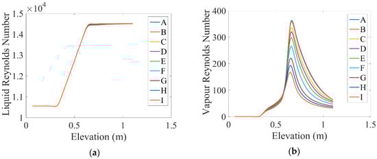 Variations in the liquid and vapor Reynolds numbers along the tube under the influence of different values of the magnetic field are shown in Figure 8a,b. It can be observed that when the distance from the beginning of the tube to the entry of the flow into the heated area increased, the Reynolds number of the liquid and vapor increased as the velocity of the phases increased, which was higher for the vapor than for the liquid, because the higher vapor velocity was due to the void that was produced by boiling. In addition, as they were affected by MHD forces, the Reynolds numbers of the vapor and liquid were damped.