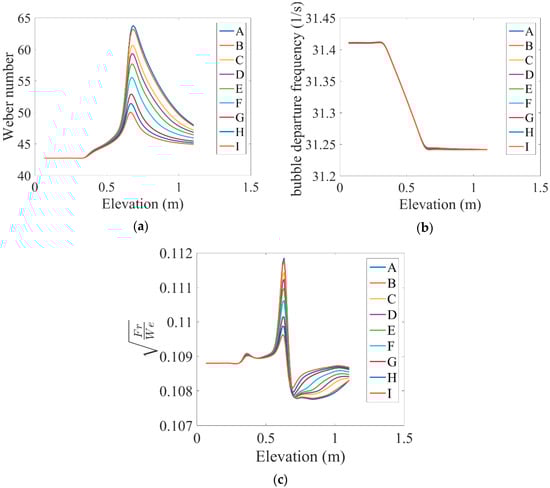 Variations in the (a) Weber number, (b) bubble departure frequency, and (c) square root of the ratio of the Froude number to the Weber number along the pipe under the influence of different values of the magnetic field (presented in Table 2).