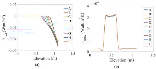 Figure 10a indicates the radiation heat flux variations along the pipe length. As shown, the radiation heat flux at the beginning of tube and even in the heated region showed a constant value of zero and subsequently increased through the influence of MHD forces. In addition, variations in the convection heat transfer coefficient on the wall along the tube length are shown in Figure 10b. It was observed that this coefficient was almost constant in the two regions at the beginning and end of the tube, with the highest convection heat transfer followed by the highest convection heat transfer coefficient in the region of nucleation boiling. The use of MHD forces slightly increased the heat transfer coefficient.