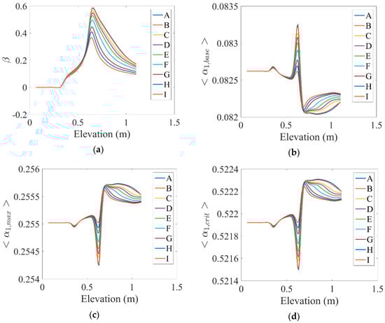 Changes in the volume fraction and the parameters of the base volume fraction along the tube length under the influence of different magnetic field values are shown in Figure 11a,b, respectively. Figure 11a shows that at the beginning of the pipe, the mentioned parameter was constant and increased as it entered the heated area. It was then controlled and reduced by the magnetic field. In Figure 11b, the base volume fraction parameter increased before the heated area, and then its amplitude was reduced by the MHD force. In addition, variations in the maximum volume fraction and the parameters of the critical volume fraction along the tube length are shown in Figure 11c,d for the various cases presented in Table 2. These two parameters decreased at the beginning of the heated area and increased with enhanced distance from the point of entry. As is shown, the MHD force had no significant effect on these two parameters.