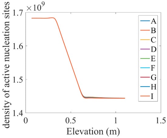 The density changes of the active nucleation site along the tube length are shown in Figure 12. As can be seen, the density of the active nucleation site initially was maintained at a constant value, and then, upon entering the heated area at the farthest point where the heating continued (the point where the volume fraction was maximized), it was reduced and then became fixed. This behavior also showed that an increase in the MHD forces did not have a significant effect on the active nucleation site.