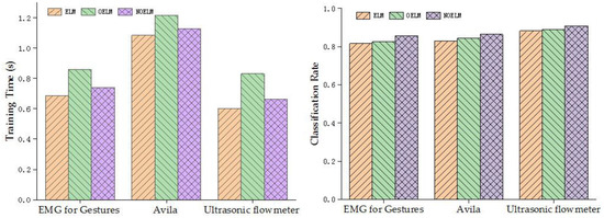 For testing the performances of the novel algorithm proposed in the paper, it is compared with other learning algorithms on the classification problems (EMG for Gestures, Avila and Ultrasonic Flowmeter) and regression problems (Auto price, Breast cancer, Buston housing, etc.), which are from the University of California Irvine (UCI) machine learning repository [22], shown in Table 1. These learning algorithms include ELM [1], OELM [16] and I-ELM [23,24], their activation function is the sigmoid function, and the number of hidden layer neurons is set as three times as the input dimension. For I-ELM, the initial number of hidden layer neurons is set to zero. In the real experiments, the key parameters such as the input weights, the biases, etc., are generated randomly from , and then, all samples are normalized into , and the outputs of the regression problems are normalized into [25]. All simulations are done in Matlab R2016a environment.